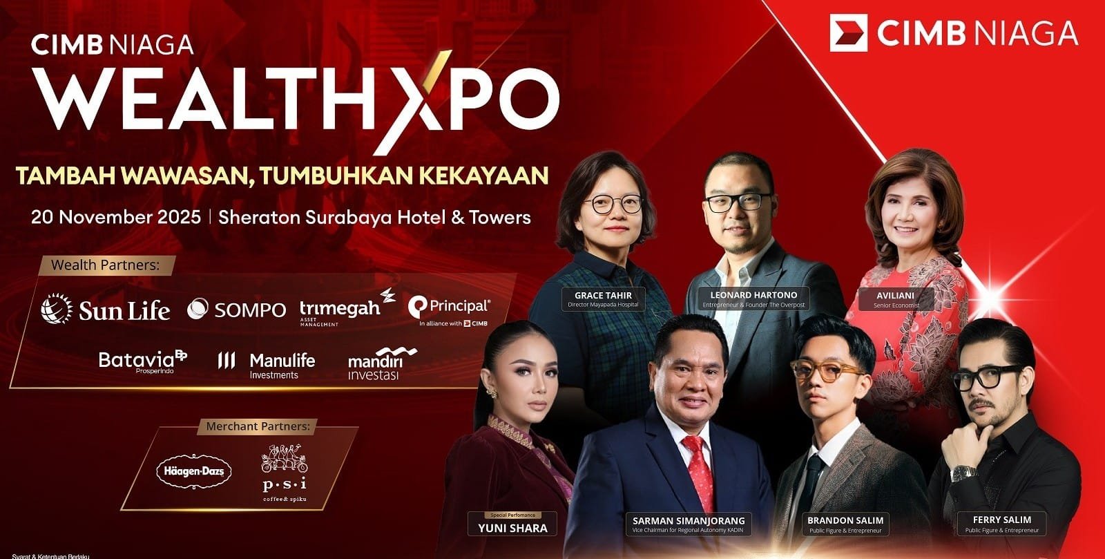 “Kombinasi antara teknologi dan pendampingan manusia menjadi kekuatan utama CIMB Niaga dalam menghadirkan pengalaman wealth management yang aman, mudah, dan relevan. Kami juga siap membantu nasabah melindungi kekayaannya dari tekanan inflasi melalui beragam instrumen investasi yang sesuai profil risiko. Nantikan Wealth Xpo 2025 di Surabaya dan Jakarta dan temukan solusi finansial yang tepat untuk mengoptimalkan kekayaan,” pungkas Noviady.