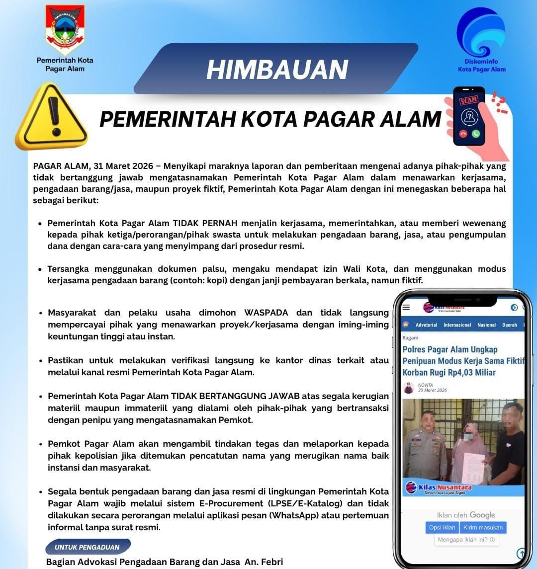 Berikut isi himbauan dan klarifikasi yang disampaikan oleh Diskominfo, Pemerintah Kota Pagar Alam tidak pernah menjalin kerjasama, memerintahkan, atau memberi wewenang kepada pihak ketiga/perorangan/pihak swasta untuk melakukan pengadaan barang, jasa, atau pengumpulan dana dengan cara-cara yang menyimpang dari prosedur resmi.