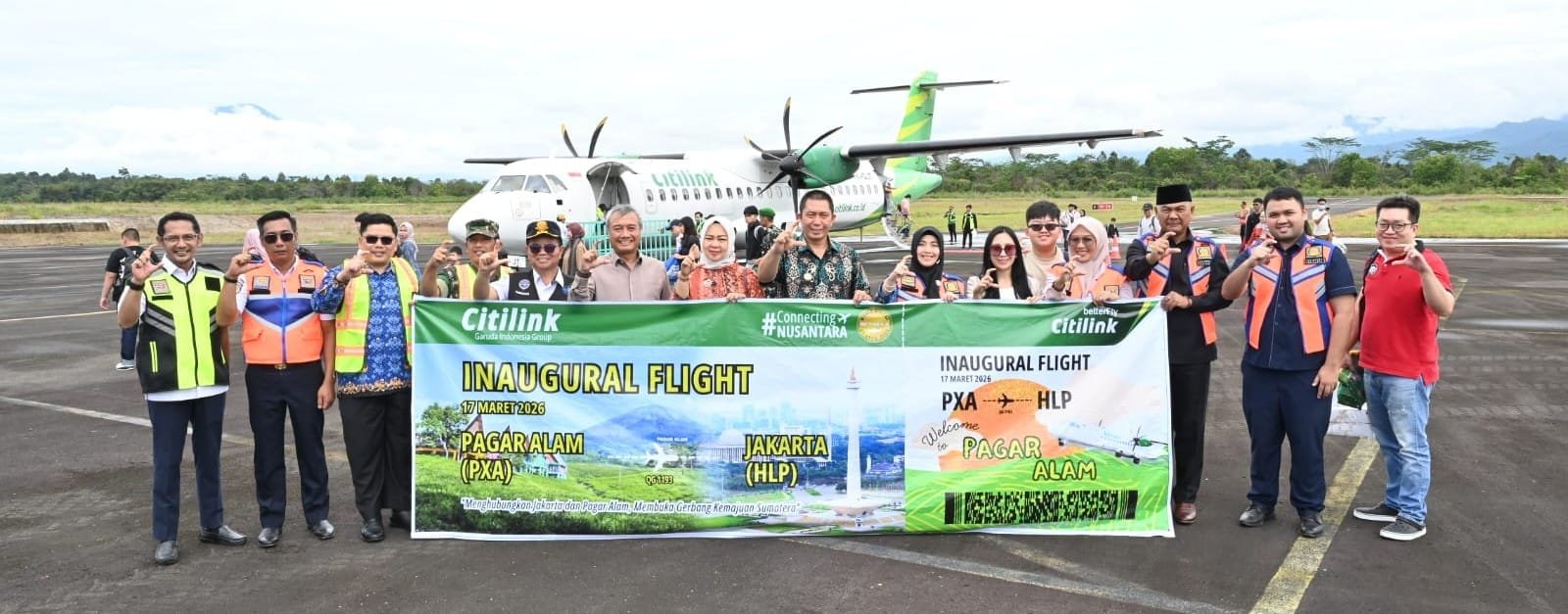 Pendaratan perdana pesawat ATR 72-600 Citilink di Bandara Atung Bungsu Kota Pagar Alam berjalan mulus dengan disambut oleh Water Salute serta ditumpangi langsung oleh Wali Kota Pagar Alam Ludi Oliansyah bersama Ketua TP-PKK Kota Pagar Alam Hera Parianti Ludi beserta puluhan penumpang lainnya, pada Selasa (17/03/26).
