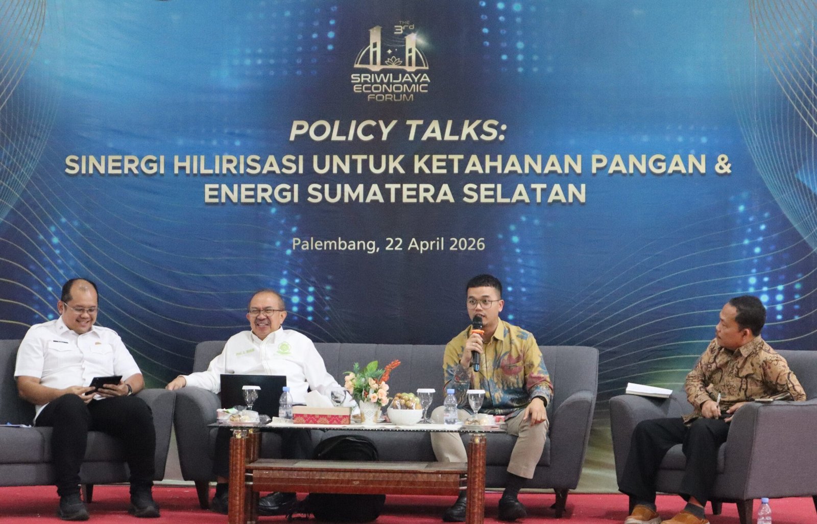 Sesi Policy Talks menghadirkan narasumber lintas sektor, yaitu Dekan Fakultas Pertanian Universitas Sriwijaya Prof. Dr. Ir. A. Muslim, M.Agr (akademisi), Plt. Kepala Bappeda Provinsi Sumatera Selatan Dody Eko Prasetyo, S.T., M.T. (pemerintah daerah), serta Investor Relations Department Head PT Bukit Asam Tbk. Aldy Pratama (dunia usaha). Para panelis menyampaikan perspektif strategis mengenai percepatan hilirisasi sebagai pengungkit utama pertumbuhan ekonomi Sumatera Selatan.